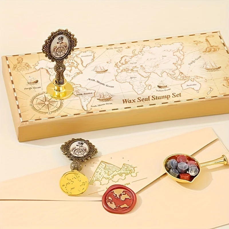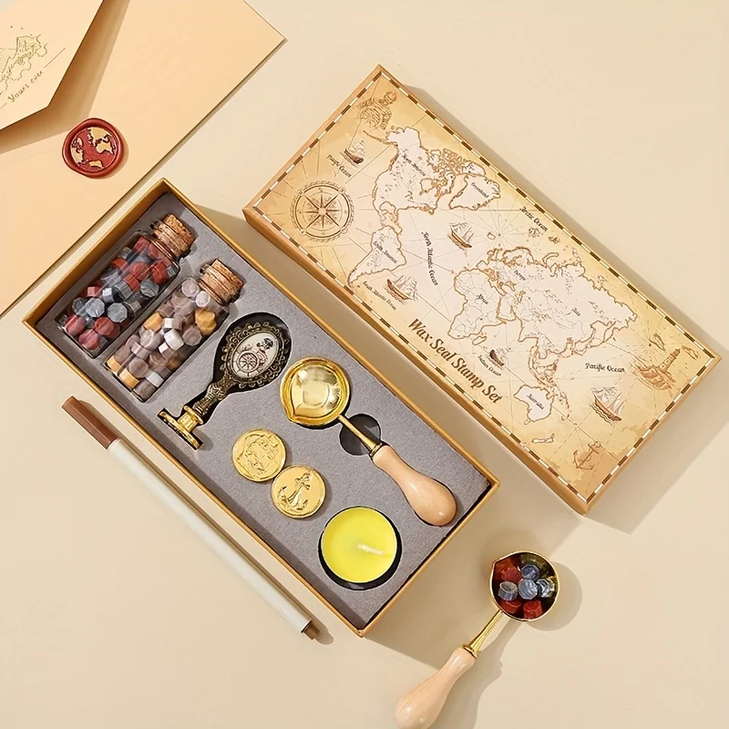 1 Set of Sealing Wax Stamp Kit, Includes Stamp Handle, Sealing Wax Beads, Wooden Handle Sealing Wax Spoon, Small Round Wax, Stamp Head, Suitable for Wedding Invitations, Envelopes, Birthday Gift Cards, Scrapbooks, Great Gift