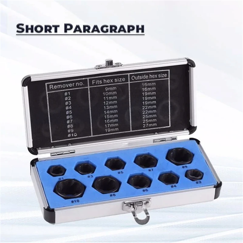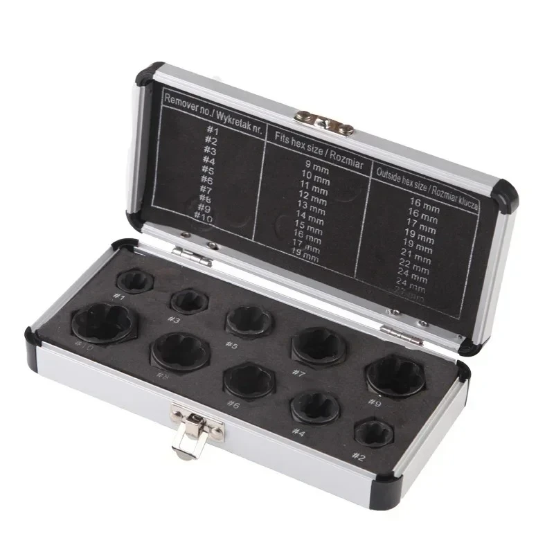 This is a set of 10 pieces sturdy tools to help remove nuts, bolts, screw heads, studs, etc.