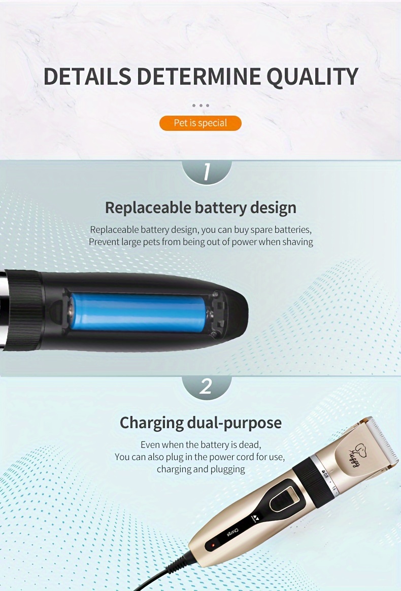 [USB Chargeable & Cordl]The pet grooming kit is equipped with a USB charger. you don't have to buy replament batteries, Lightweight and cordl design for easy use, you can groom dogs outside and does not worry an extension cord