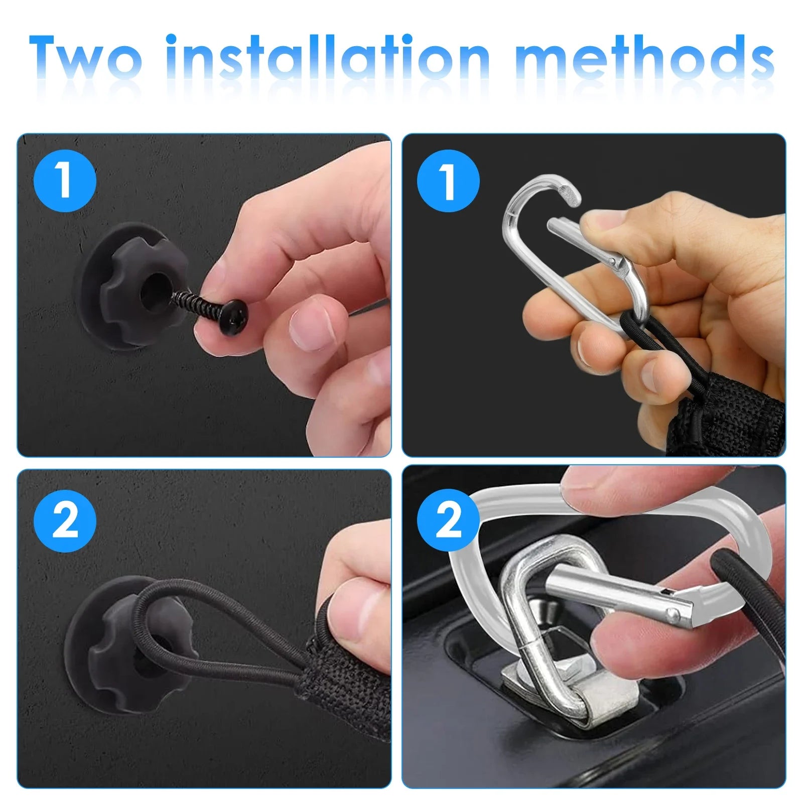 Multiple Installation Methods : This truck bed cargo net offers two installation options : If your truck has existing hooks or bed rails , simply use the D rings to connect the corner ropes to the truck's hooks or bed rail accessories . If there are no existing hooks , you can drill holes in the truck bed walls and secure the hooks with screws for installation