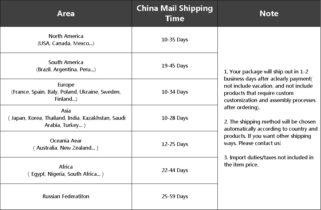 3. Your order will ship out in 24-72 hours when confirm payment( not include vacation, and not include products that require custom and assembly after ordering).