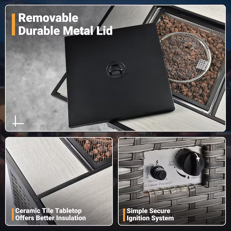 - Smokeless Propane Gas Fire Pit Table: insulated ceramic tiles table top, more safer with CSA certification, serve as an outdoor dining table with the metal lid covered, with a heat output of 50,000 BTU, include a free furniture cover for fire pit and lava rock
