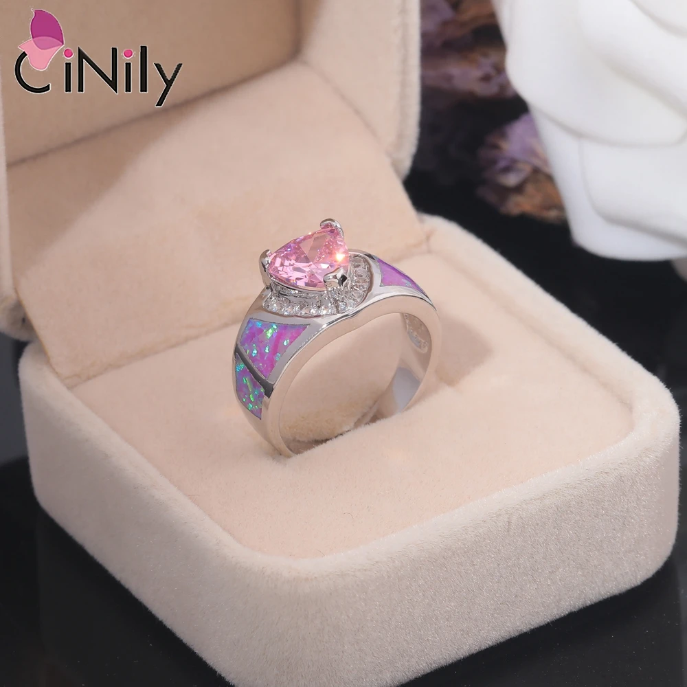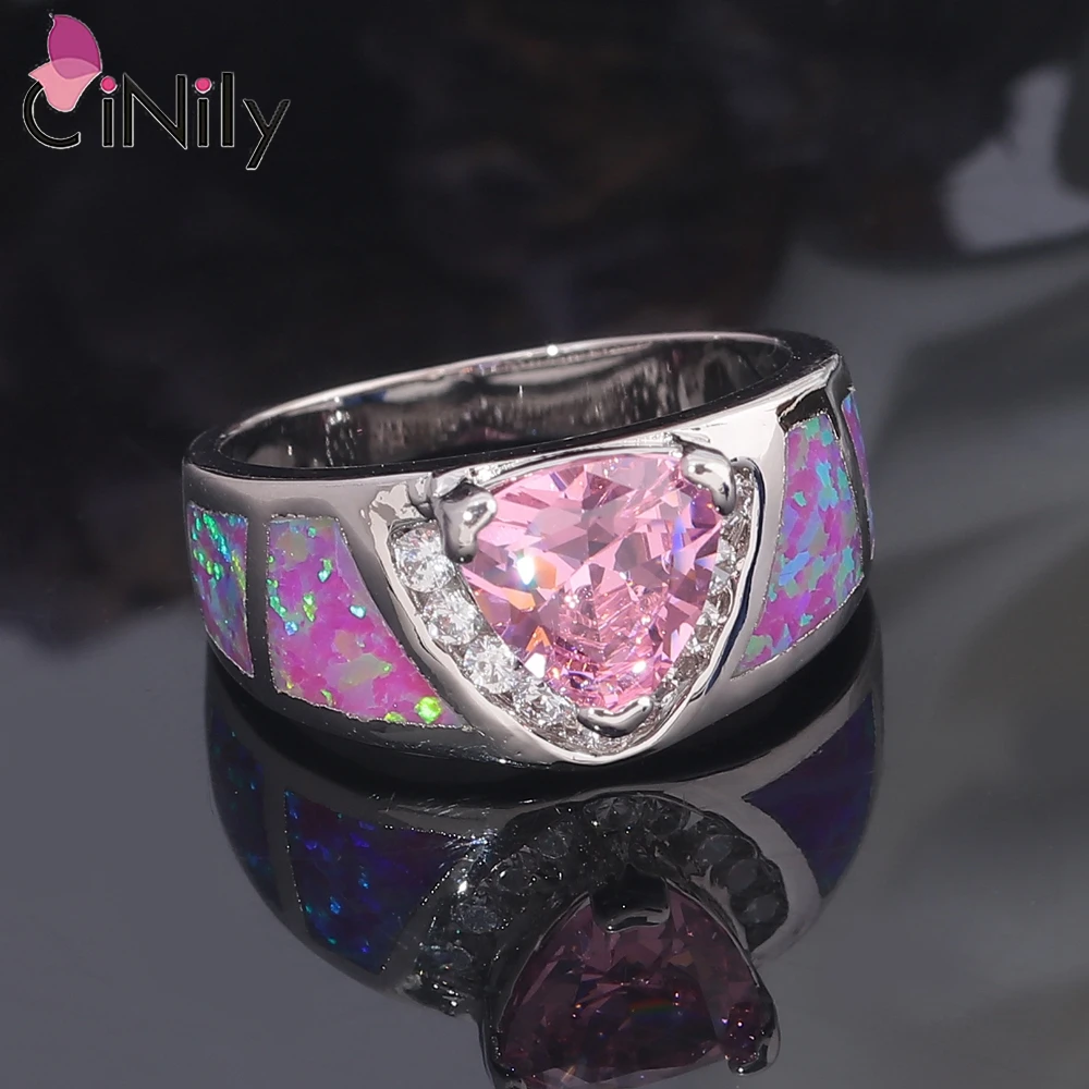 CiNily 925 Sterling Silver Pink Fire Hearted Opal Stone Rings with Pink Zircon for Women Wedding Party Fashion Jewelry Size 5-12