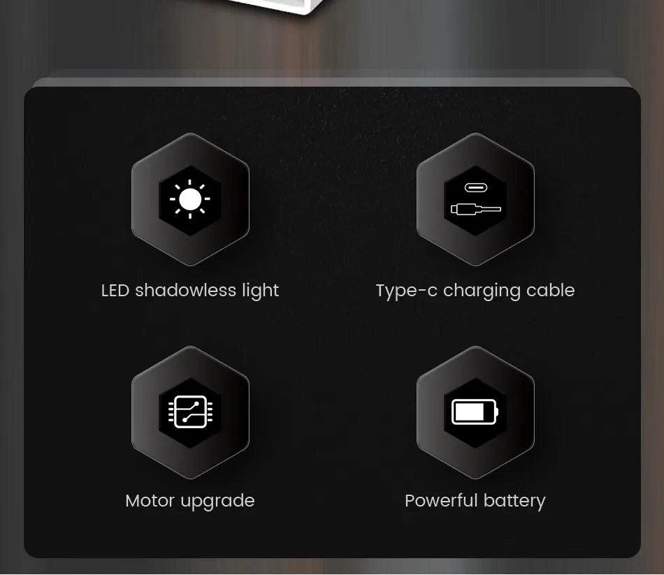 1.LED shadowless light 2.Type-c charging cable 3.Motor upgrade 4.Powerful battery