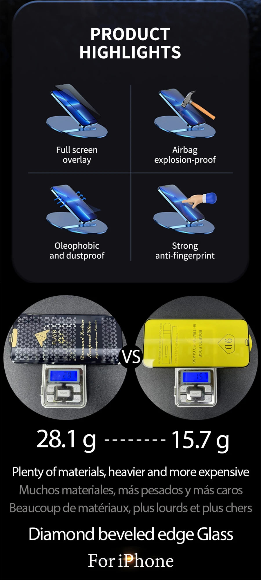 - Compared with ordinary glass, the new Cut Edge Luxury Tempered Glass has enhanced oleophobic anti-fingerprint and hand feel and super explosion-proof function. (Weight: 28g, Thickness: 0.4mm.)