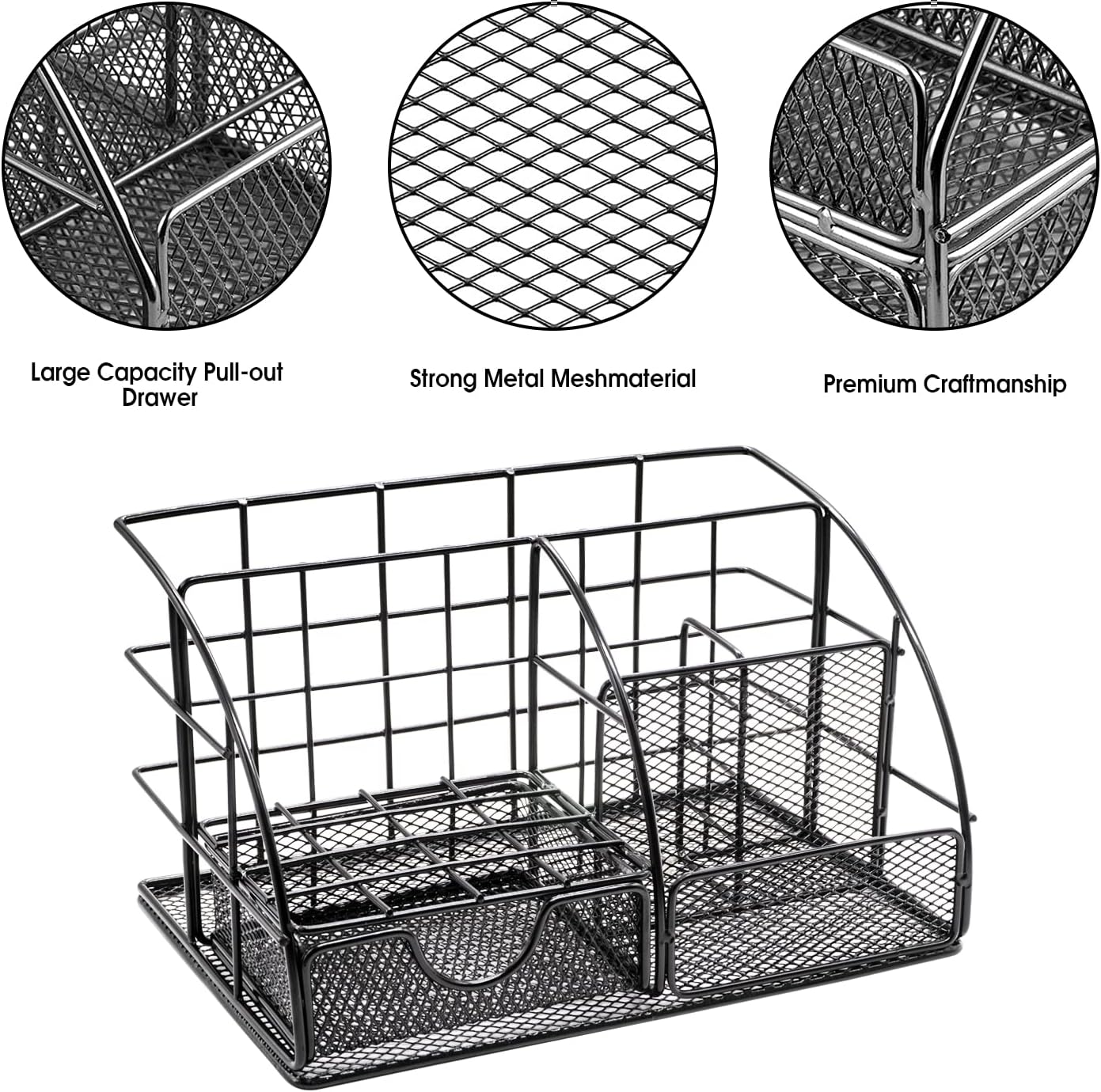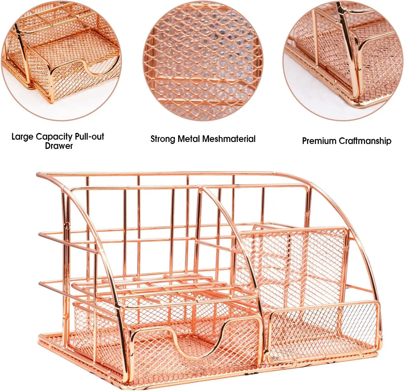 【Elegant Desk Organizers】Our cute and stylish desktop organizer features 5 separate compartments and 1 mini sliding drawer. The desktop organizer is adopting with a powder coat finish and electroplating technology ,wear-resistant, anti-oxidation, and long lasting and does not fade . The rounded corners metal rim and trim add to the visual appeal, and protect your desk.