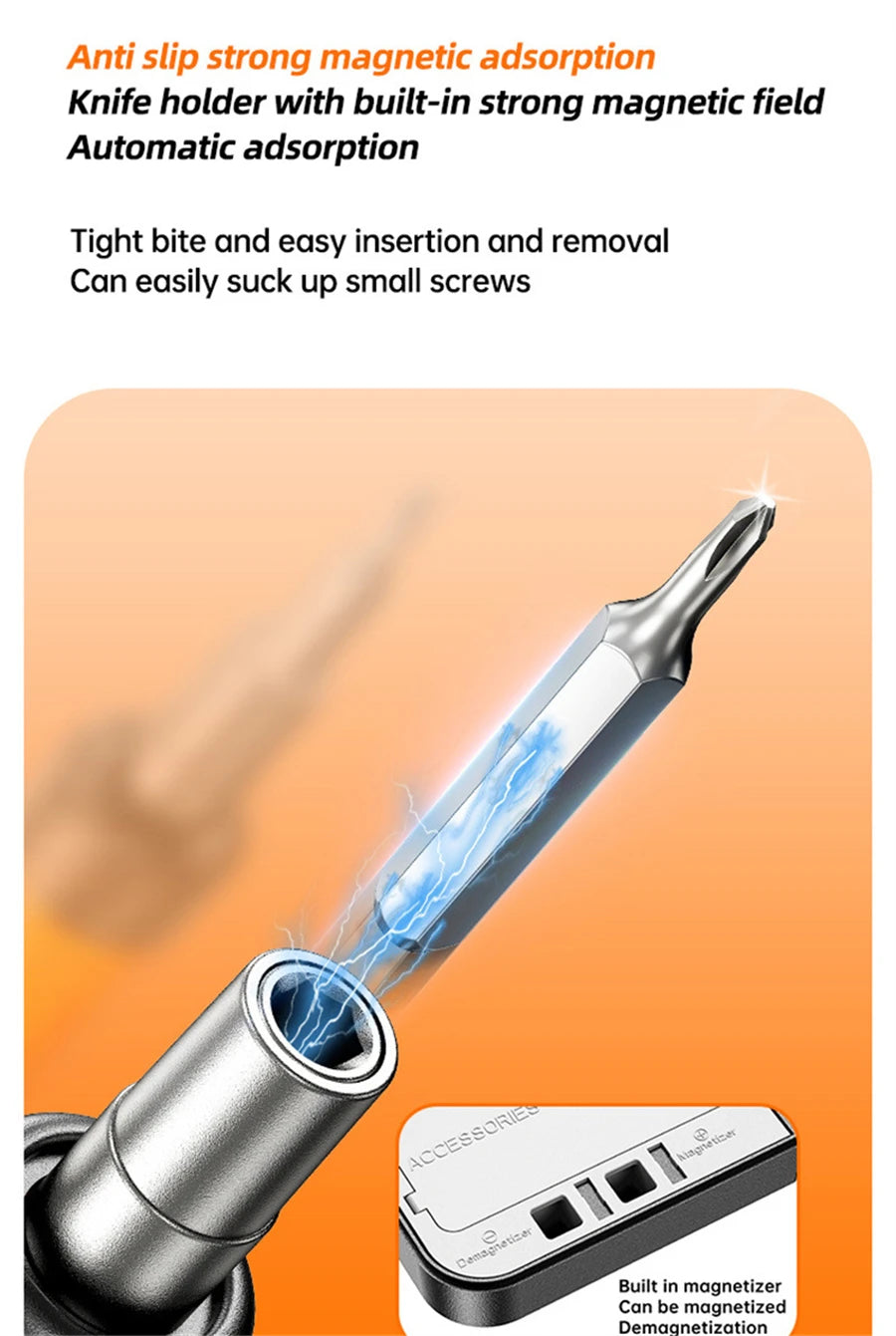 Product 1set includes: 38pcs screwdriver bits, 1pcs charging cable and 6pcs disassembly picks