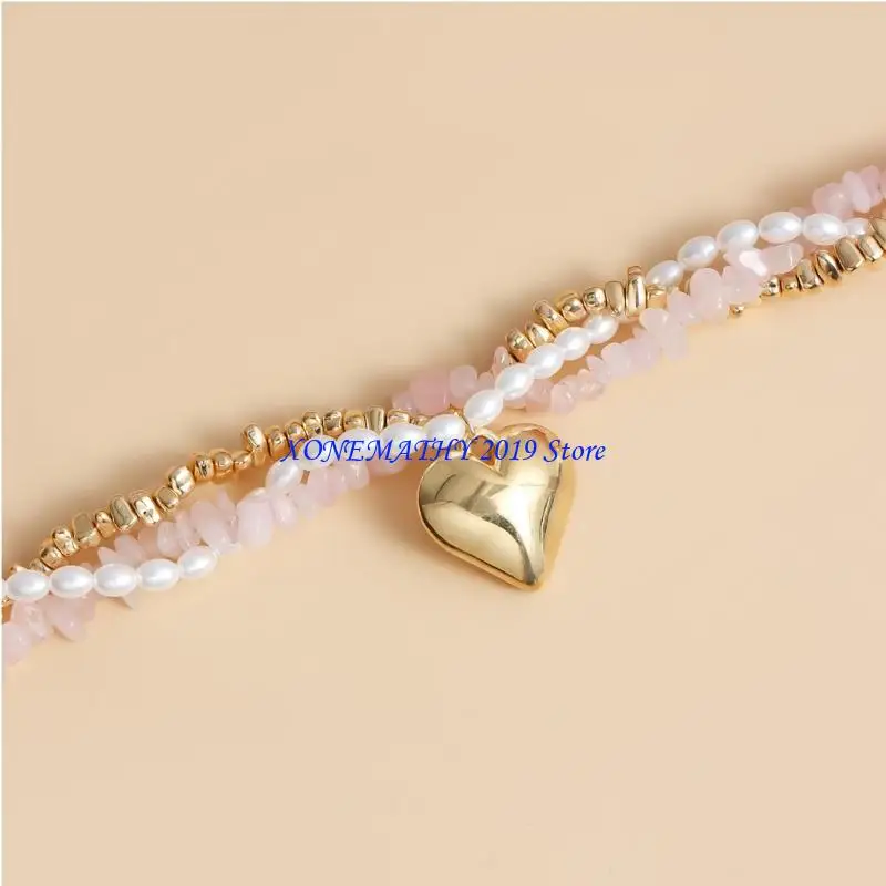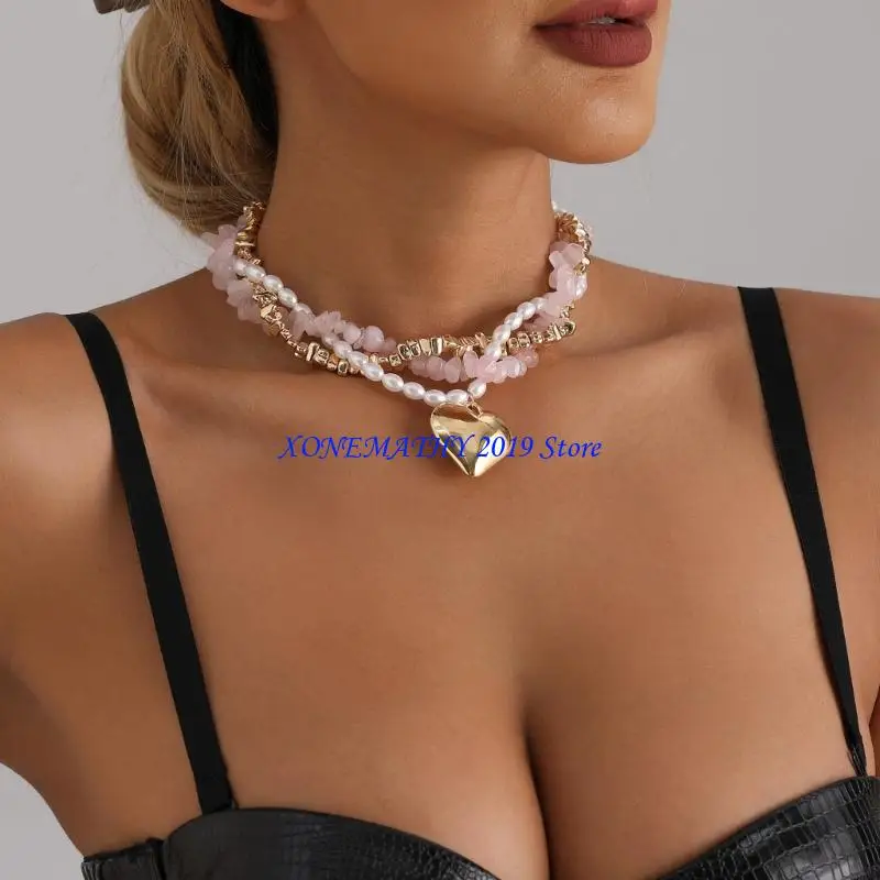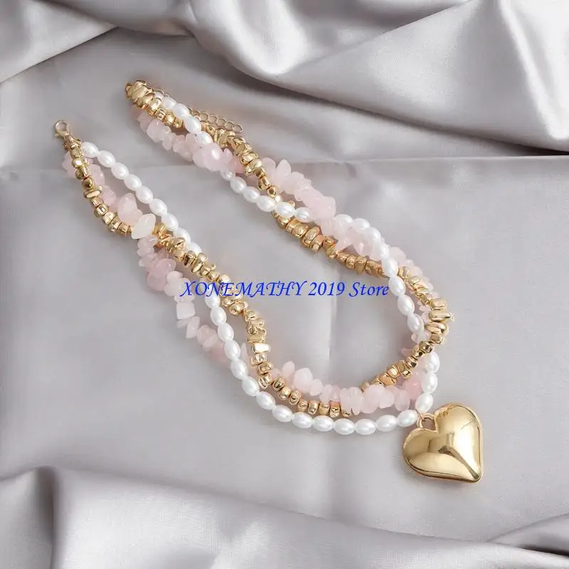 Elevating your with this multilayer pearls collar bone necklace, featuring a delicate love heart pendant and adjustable chain for personalized elegances in gold tone alloy jewelry.