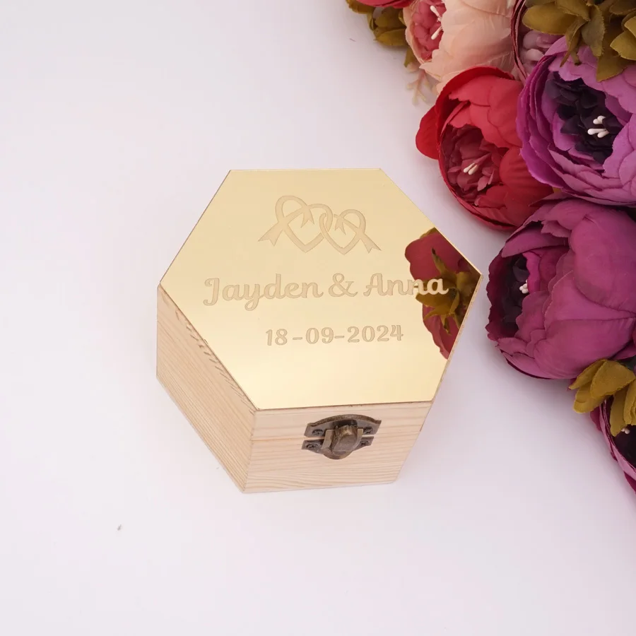 Hexagon Shape Acrylic Mirror Cover Box With Hearts Custom Name Date Party Gift Wood Boxes Wedding Candy Holder Display Decor