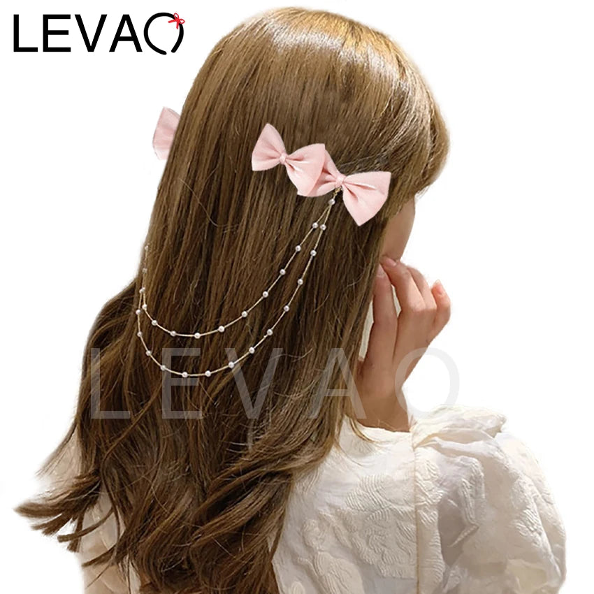 LEVAO Women's Sweet Double Bow Duckbill Clip Tiaras Pearl Chain Decorative Hairband Girls Fashion Hairpin Hair Accessories