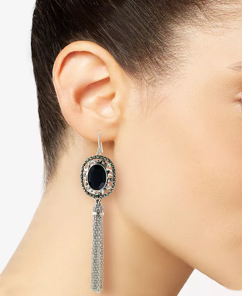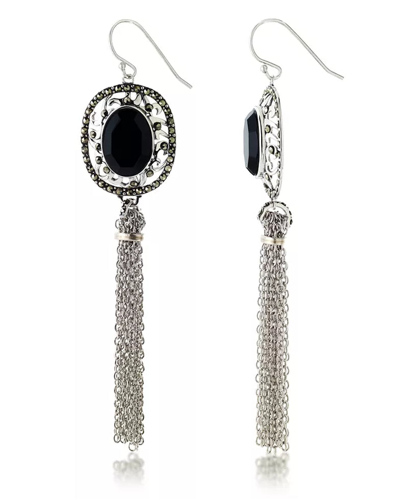 Red carpet couture These glamerous earrings boast two large genuine oval faceted onyx gems set in crowns of sterling silver and genuine marcasite. Flowing sterling silver tassels cascade down from these magnificent earrings.