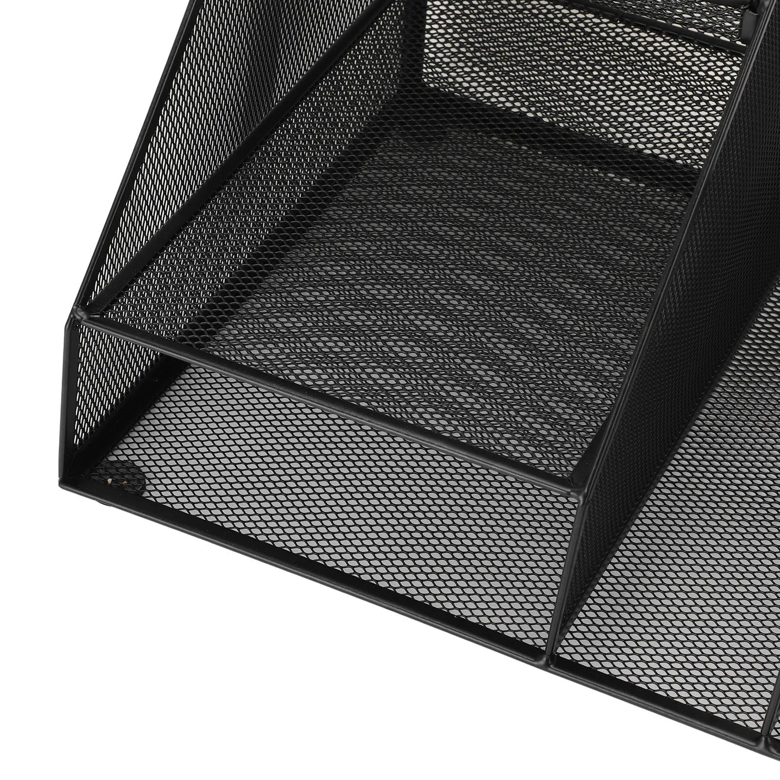 1. Versatile Storage Solution: This mesh desktop organizer file sorter allows you to combine multiple separate organizers into one cohesive unit, effectively decluttering your work space. It is suitable for organizing small office supplies and provides ample storage space for documents, making it an essential tool for maintaining order and efficiency in any setting.2. Rugged And Lightweight Construction: Made from a lightweight iron mesh structure with a solid base, this metal mesh desktop organizer offers high strength and durability. The powder coated finish is safe, ensuring that your work space remains safe while maintaining a slick aesthetic. The stable design prevents sliding or wobbling during use, providing a good storage option.