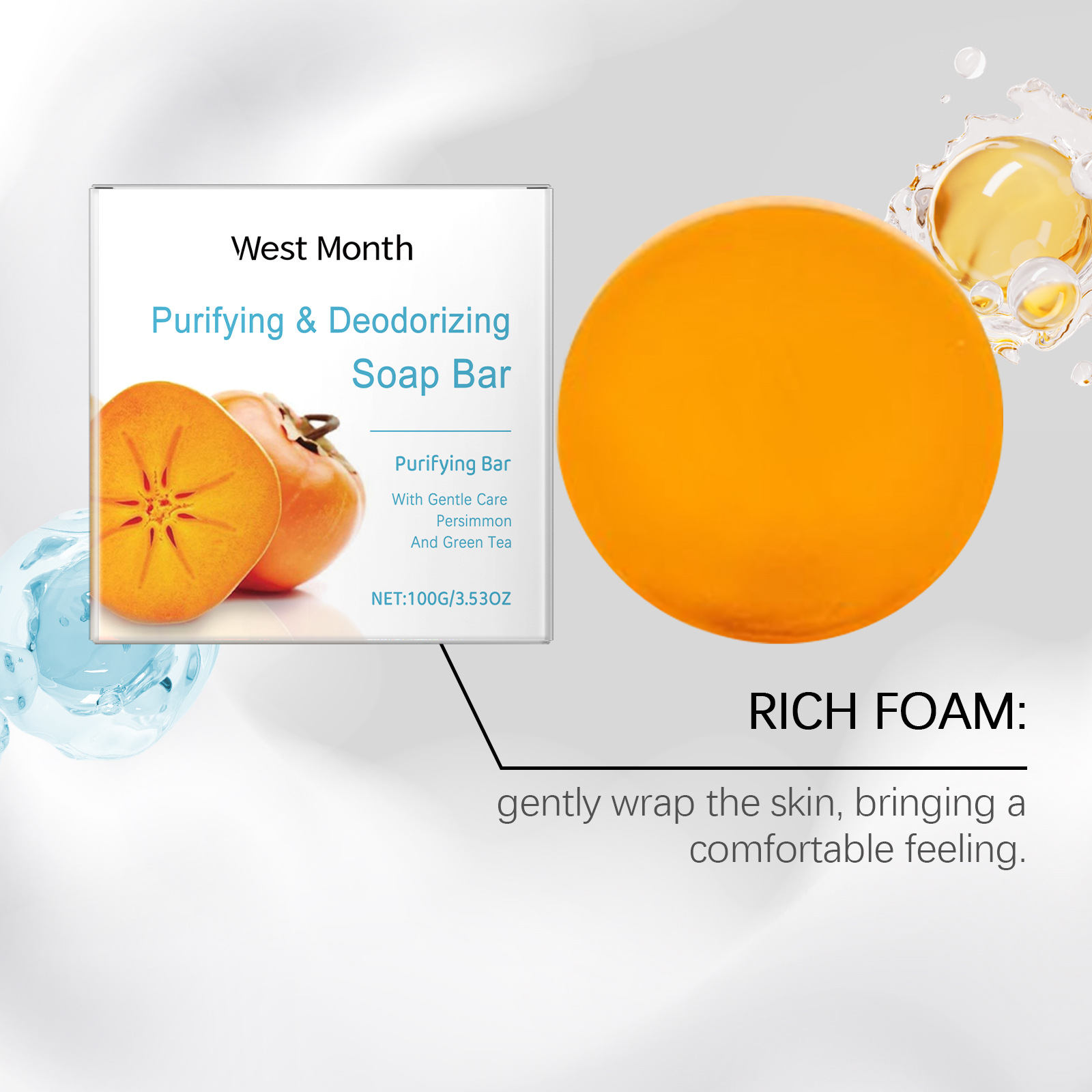 West&Month Persimmon Soap Bar Cleansing Deodorizing Remove Stains Rich Foam Lasting Fragrance Freshness Anti Sweat Odor Shower Bathing Soap 100g