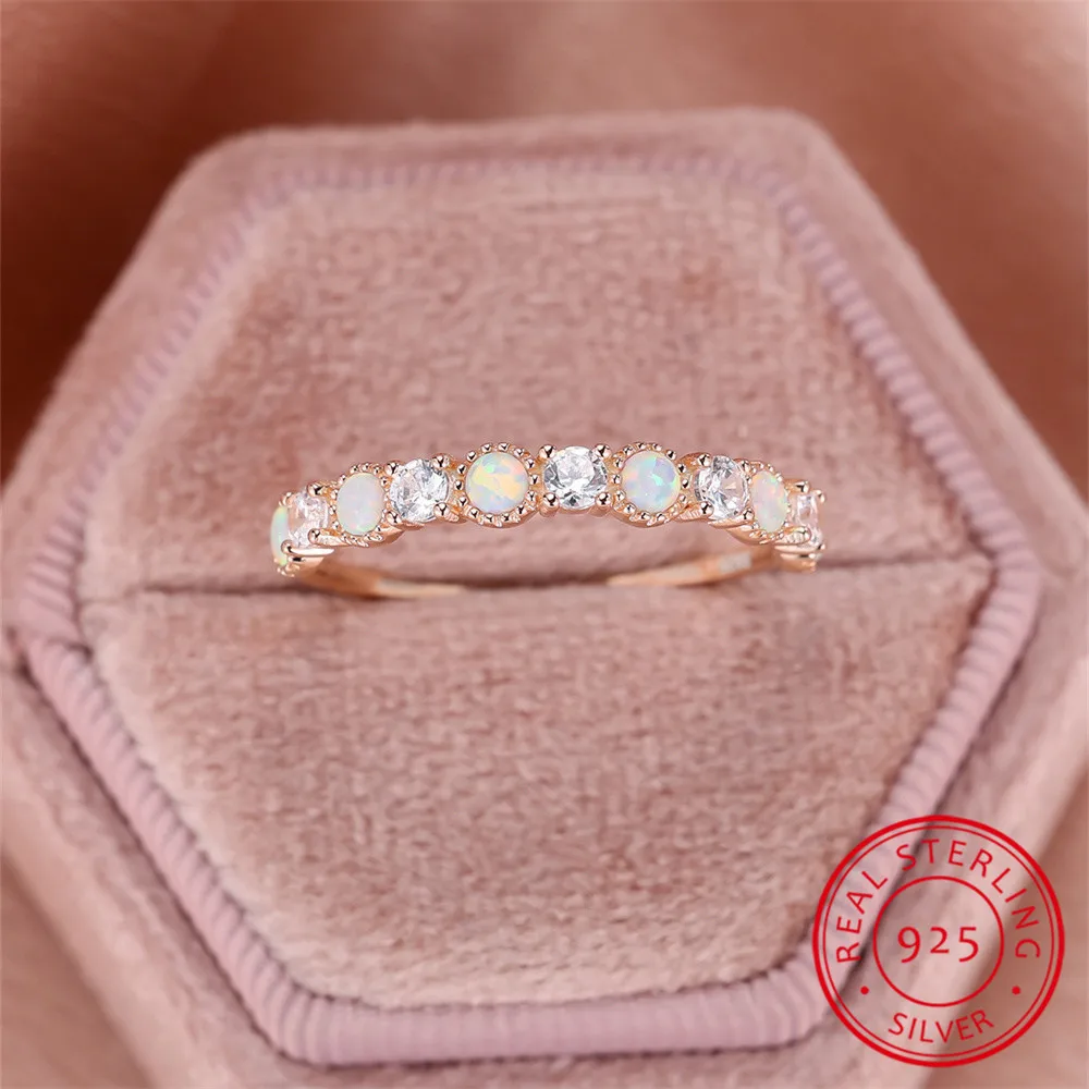 Real 925 Sterling Silver Engagement Ring Single Row White Zircon Round Opal Rings For Women Gold Color Wedding Band Jewelry