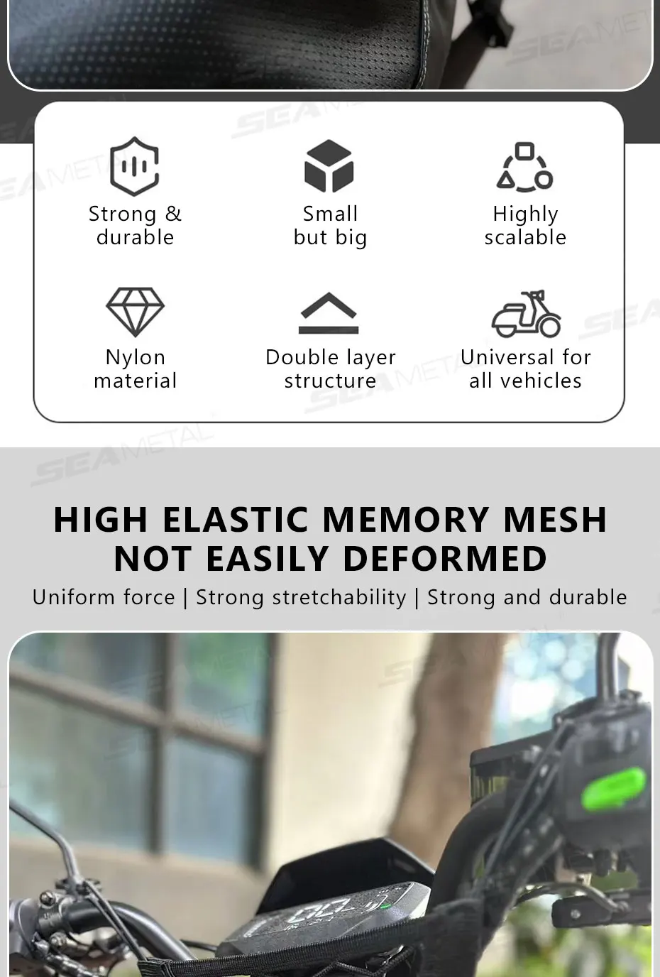 5. Compact Storage——The cargo bike scooter mesh is designed not only for strength but also for convenience. When not in use, it can be easily folded into a compact size for effortless carrying, whether it's in a backpack or a motorcycle storage box, making it an ideal travel accessory for any two-wheeled adventurer.