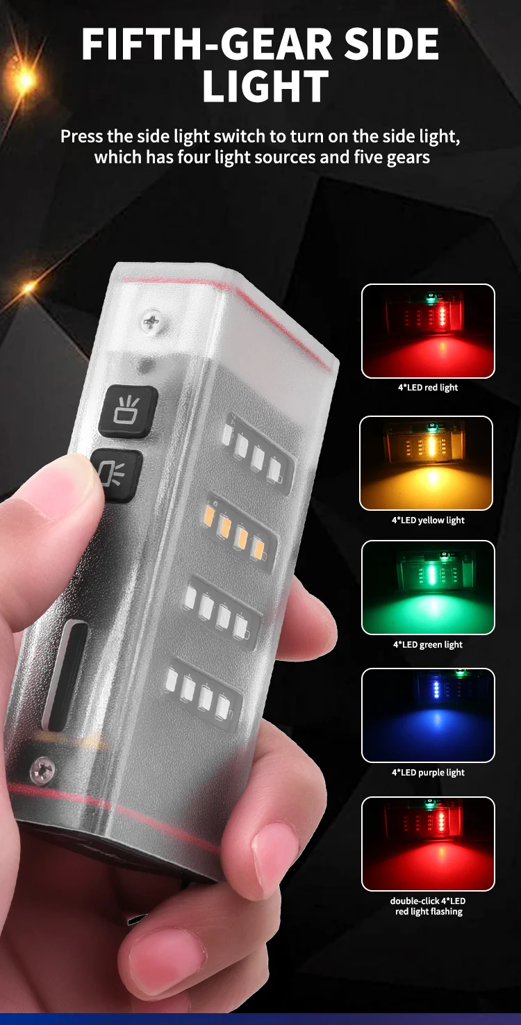 Side light switch 5 modes: 4 * LED red light -4 * LED yellow light -4 * LED green light -4 * LED purple light - double-click 4 * LED red light flashing; Staying in any gear for 8 seconds and pressing it again the light will turn off.