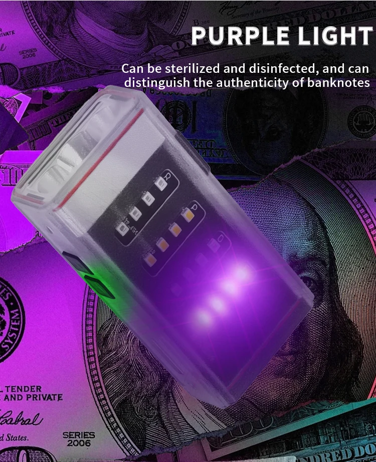 Auxiliary Light Modes: Red flash (double-tap), red, yellow, green, and UV light.