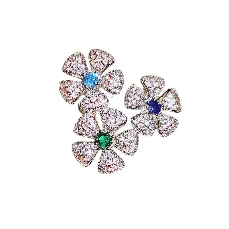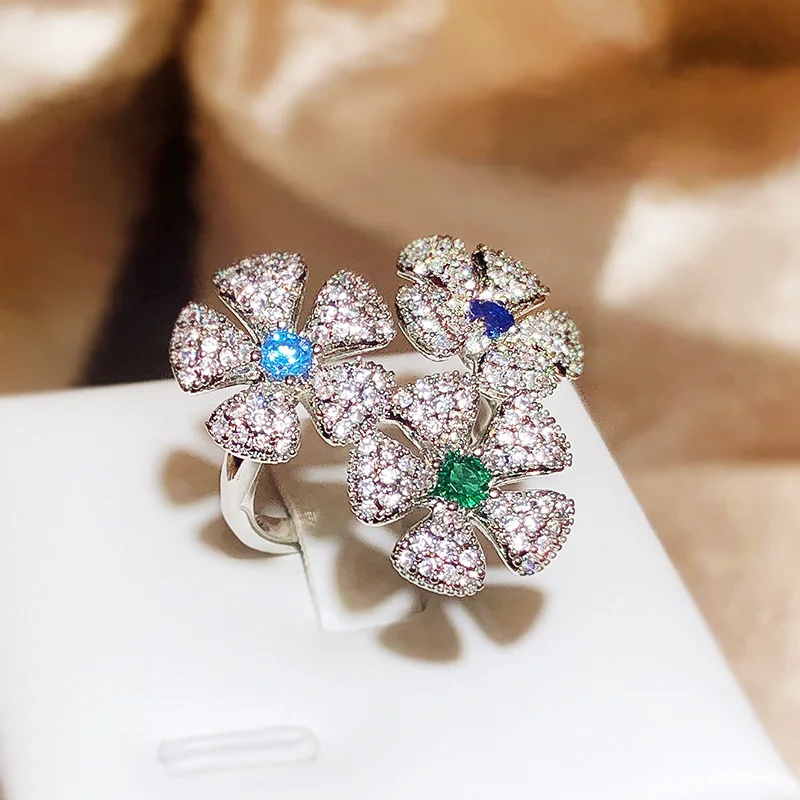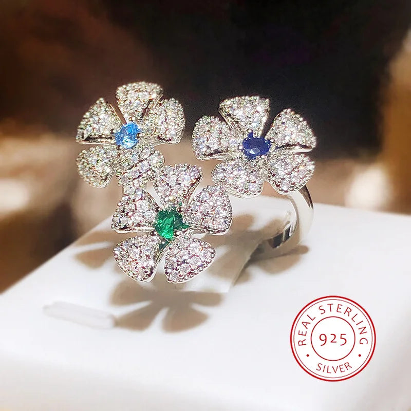 Super Fairy Creative Flower Design Open Ring Luxury Full of Diamond 925 Silver Cocktail Party Ladies Premium Color-proof Jewelry