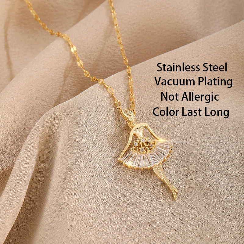 Sweet Elegant Ballerina Girl Crystal Zircon Pendant Necklaces For Women Korean Fashion Ladies Sexy Stainless Steel Jewelry Gift