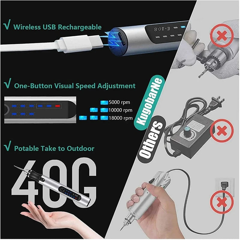 IMPROVED WIRELESS ELECTRIC GRINDER PEN: This grinding pen comes with rechargeable lithium battery, so you can use it anywhere.