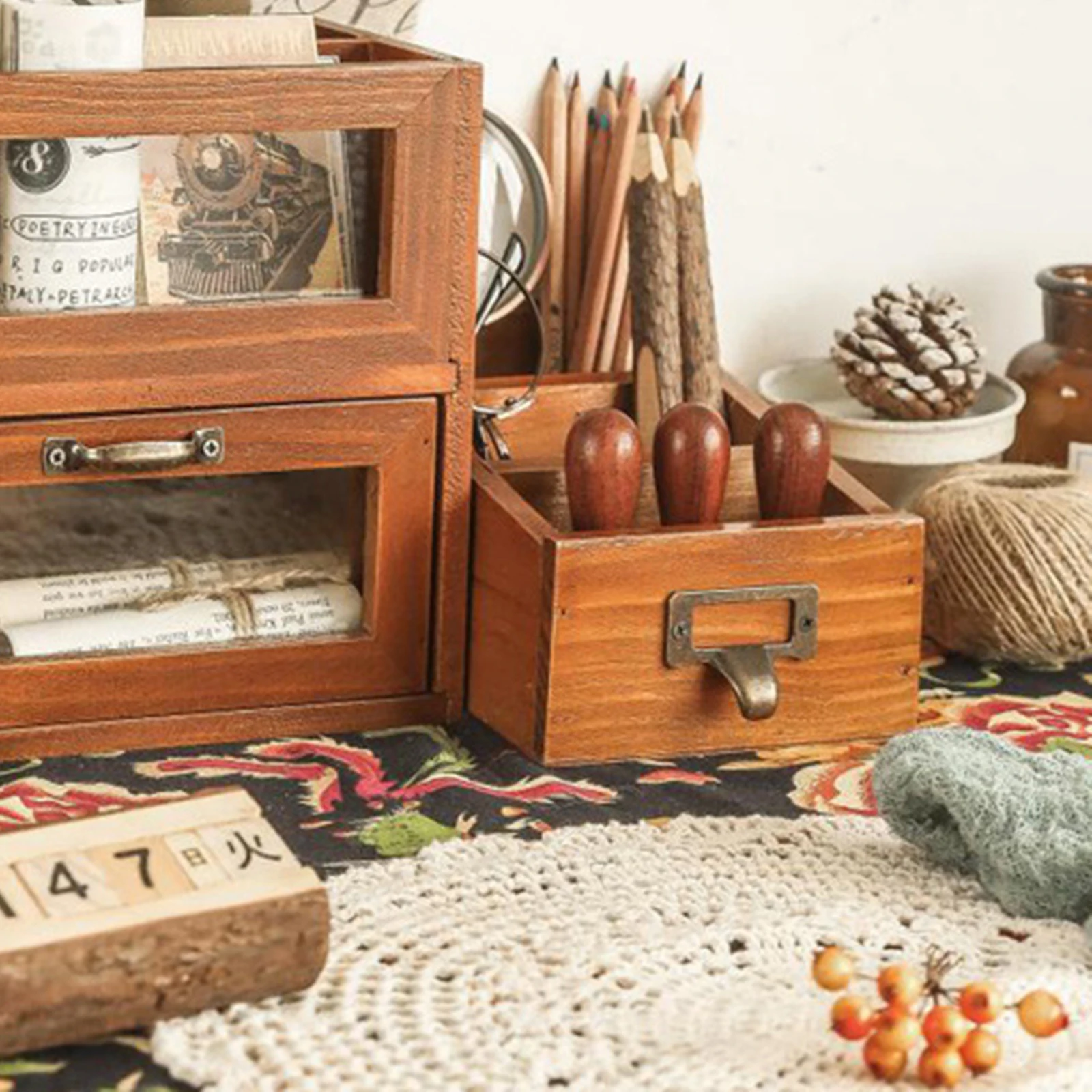 【Product】This is a vintage wooden desk organizer, great for storing remote controls, stationery, and makeup brushes. It can also serve as a pencil holder or small storage box on your study table.